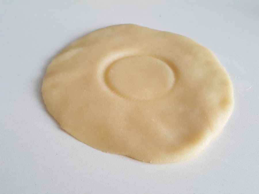 7. - Intenté hacerlo de forma original pero con un mortero, con un bote de cristal, pero al final, "ná de ná" un disco de masa, y el el centro pude una de las bolas de relleno. Y con el pellizco que quité de masa, lo aplasté también y se lo puse encima.