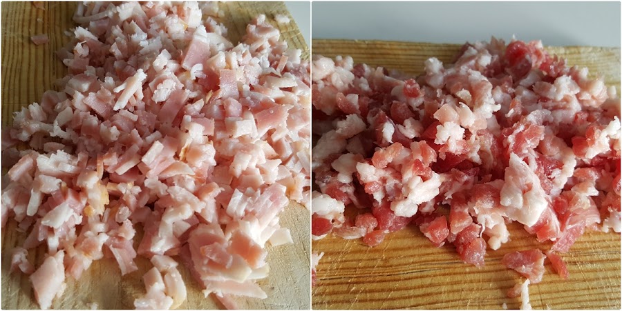 1. - Comenzaremos preparando el relleno, que yo, como quería que parecieran más rústicos, me he dedicado a picar la panceta y el bacon con cuchillo, pero podéis picarlo en una picadora.