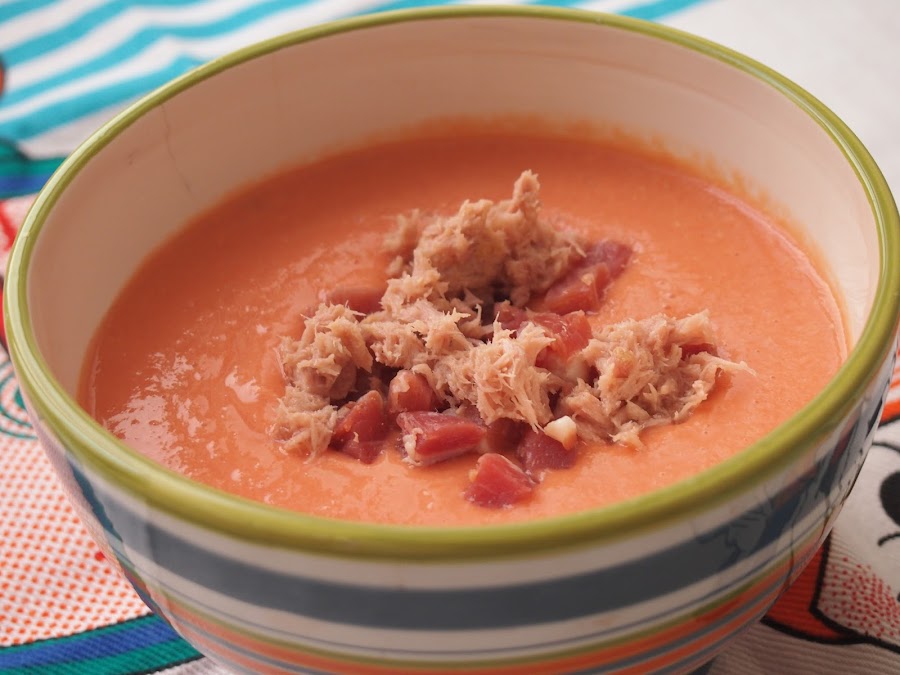 Servimos la porra en cuencos individuales, añadimos el atún desmigado, los taquitos de jamón serrano para terminar y rematar el plato un chorreoncito de aceite de oliva por encima.
