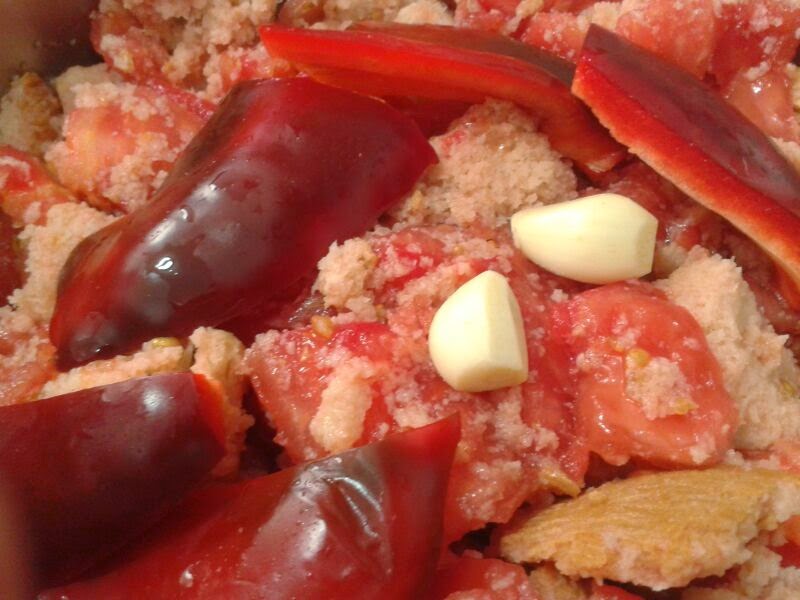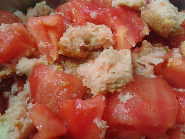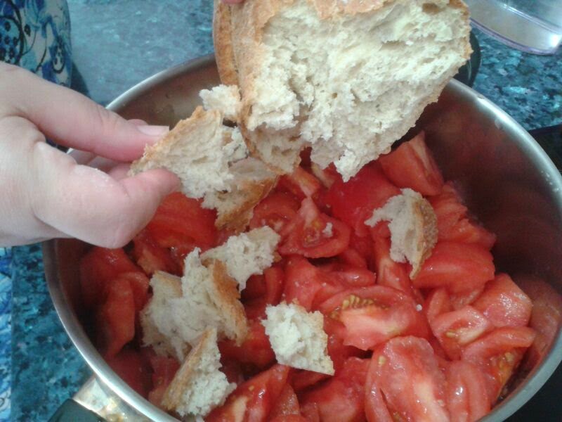 Mezclamos con las manos bien el conjunto. La cantidad de pan necesaria la vemos dependiendo del jugo del tomate que haya en el fondo. Si una vez empapado todo el pan sigue habiendo jugo, debemos añadirle un poco más.
