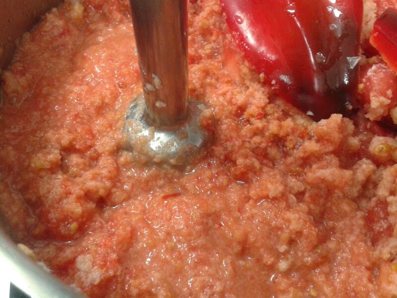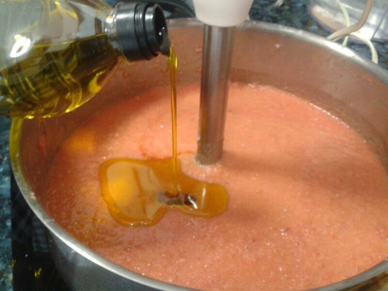 El último paso es emulsionar el aceite. Como si de una mayonesa se tratara, ponemos la batidora en funcionamiento y vamos echando medio vaso de aceite despacito. Veremos que ha emulsionado cuando no quede aceite en la superficie y el color cambie de rojo a un tono anaranjado debido a la emulsión.