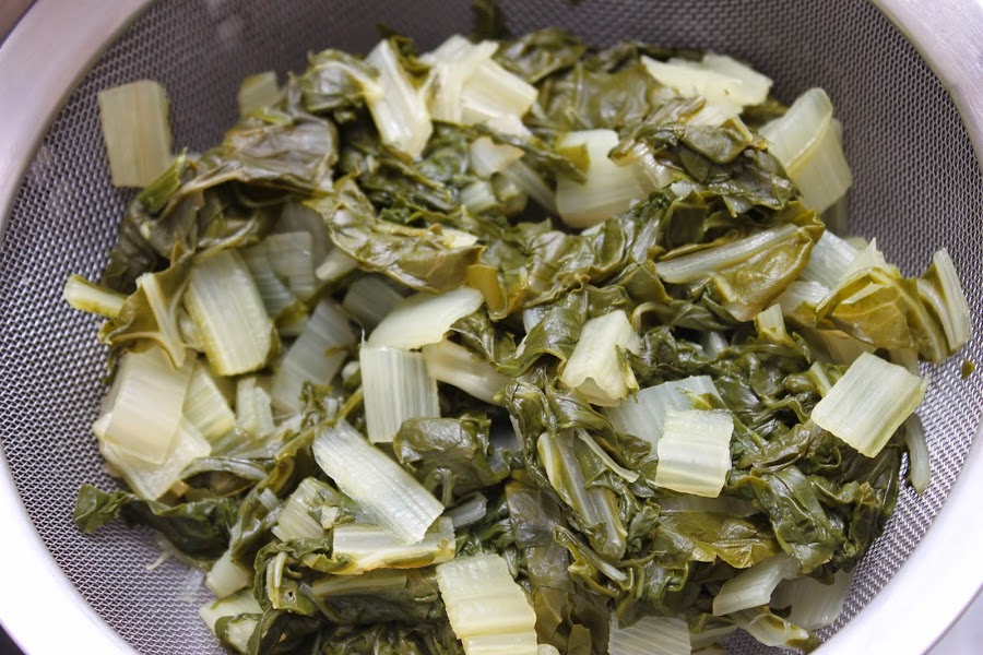 Una vez cocidas las acelgas las dejamos escurrir del agua. Ponemos una sartén adecuada en tamaño al fuego con el aceite del refrito anterior,