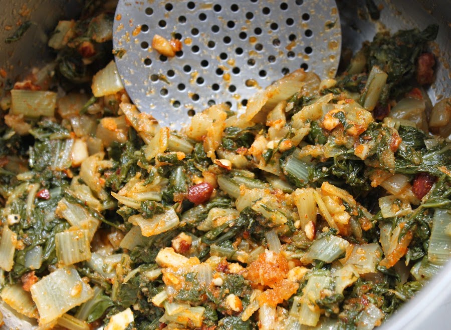 añadir el pimentón retirando la sartén del fuego para que no se queme este, echamos las acelgas y el majáo y lo volvemos al fuego con 1/2 vaso de agua,