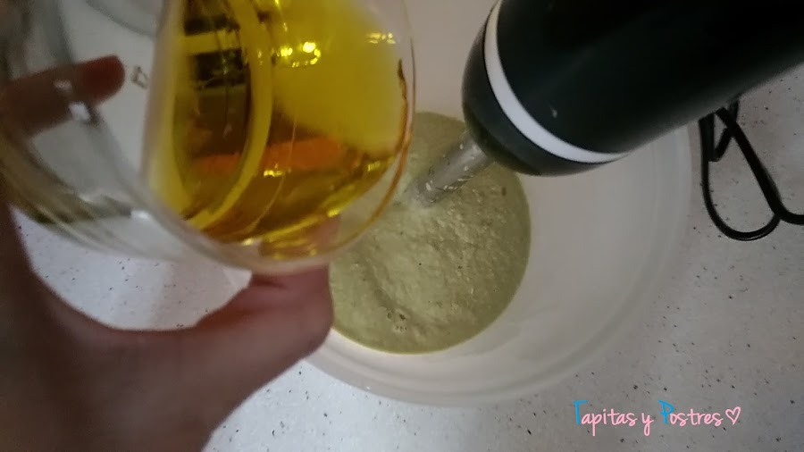 Agregamos agua para dejarla más cremosa y que nos cueste menos triturar y emulsionamos con el resto del aceite. Ahora, si nos gusta, añadimos el vinagre y seguimos batiendo.