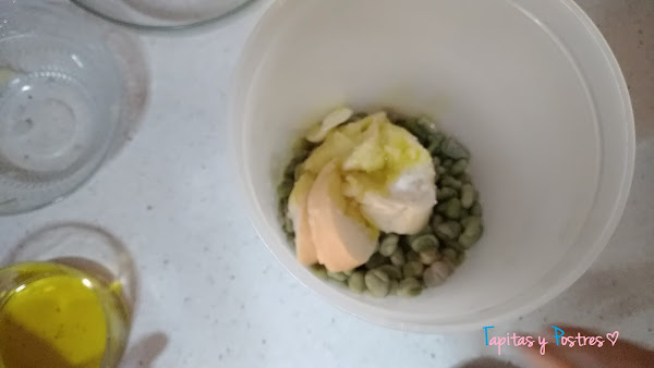 Ponemos las almendras, habas, pan (con el agua que pueda tener), el ajo, la sal y la mitad del aceite. Trituramos hasta tener un puré espeso. Agregamos un poco de agua, la suficiente para que la mezcla quede mas cremosa y ligera. Añadimos el vinagre si nos apetece, a mi si me gusta ponerle un poquito, y seguimos batiendo añadiendo el resto del aceite en un hilo para emulsionar, como cuando hacemos mayonesa. Tiene que quedar una crema espesa pero lisa y homogénea. Dejamos en la nevera para servir fresquita.