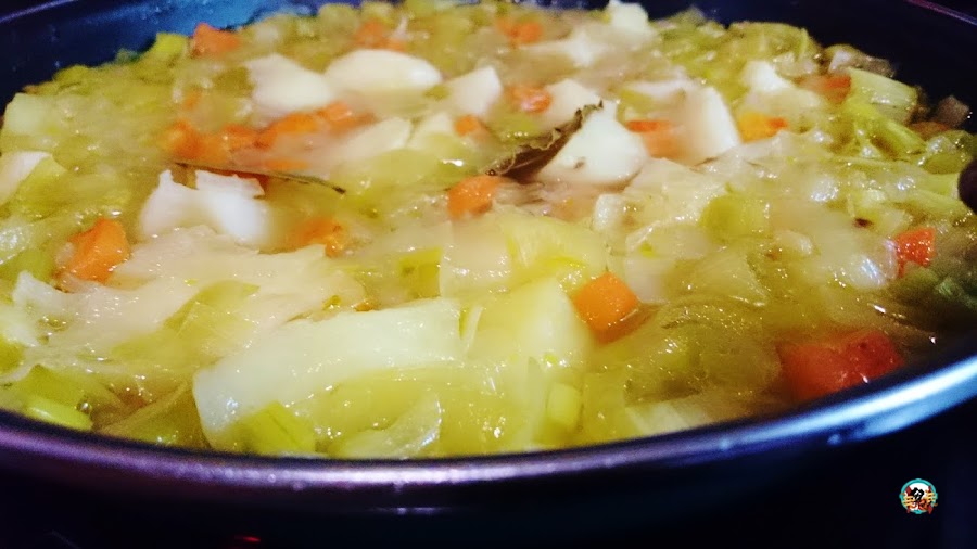 2.- En una sartén sofreímos con un poco de aceite la cebolla, le añadimos la sal y el laurel. Cuando la cebolla este trasparente le añadimos las zanahorias y las rehogamos, removiendo de vez en cuando para que no se queme la cebolla. Pasado unos 5 minutos incorporamos las patatas troceadas, cocinamos otro 5 minutos y remocemos de vez en cuando. Añadimos el puerro y rehogamos con el resto de las verduras 5 minutos más. Cubrimos las verduras con agua y cocinamos 35 o 40 minutos a fuego bajo esta que las verduras estén tiernas.