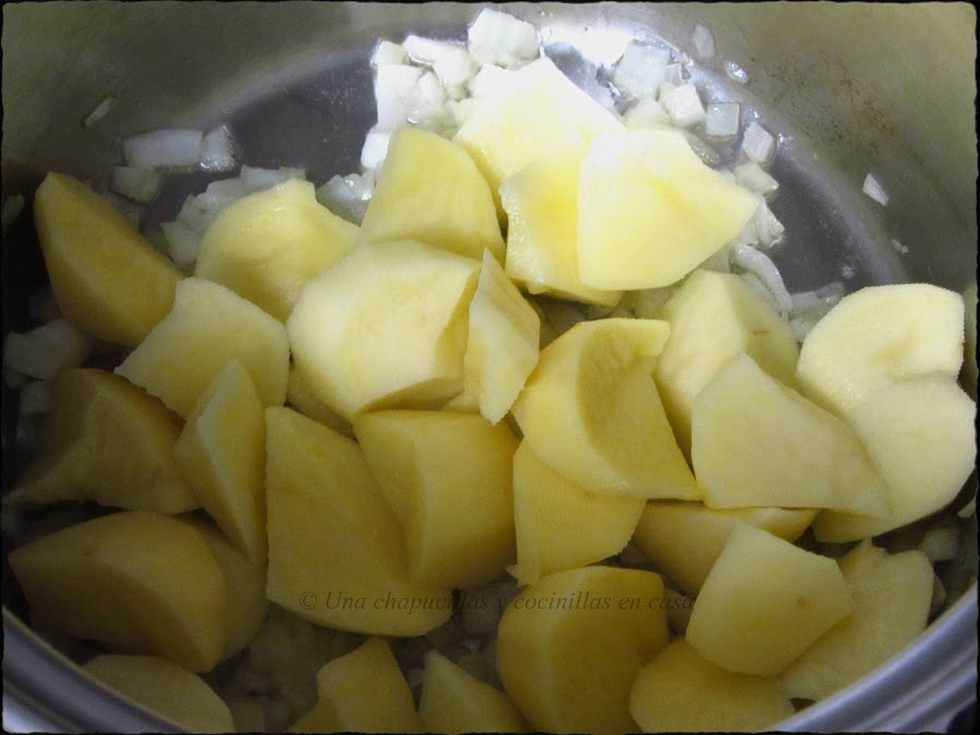 Antes de que empiece a dorar la cebolla, agregar las patatas y rehogarlas un poco.