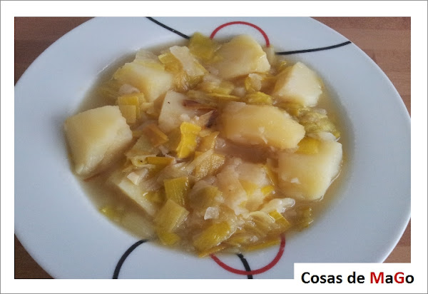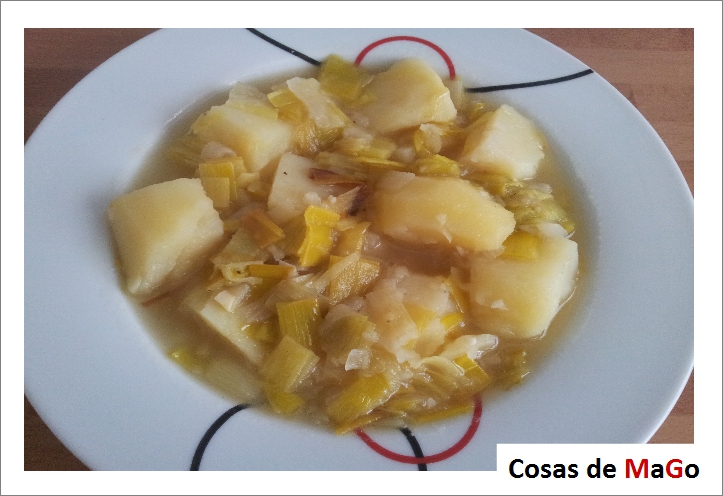 Preparación:En una cacerola se pone a calentar aceite. Se trocea una cebolla y se pone a pochar. Se limpian los puerros, se trocean y se añaden. Mientras van sofriendo la cebolla y el puerro se pelan la patatas, se cachan y se añaden a la olla. Se añade un ajo machacado. Se salpimenta todo y se pone un chorrito de vino blanco. Pasados 5 minutos se cubre con agua, se rectifica el punto de sal y se deja que hierva hasta que esté tierna la patata.
