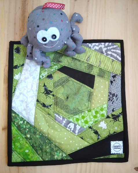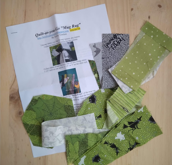 Entre los extras que mi compañera, Kathy de Kwilty Pleasures me envió estaba un kit para hacer un posatazas con un tutorial de su blog y me enviaba todas las telas necesarias, incluso la guata.