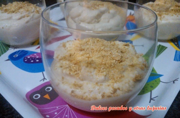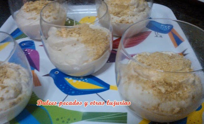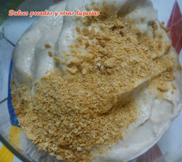 Repartimos en vasitos o copas y le echamos un poco de galleta molida por encima.