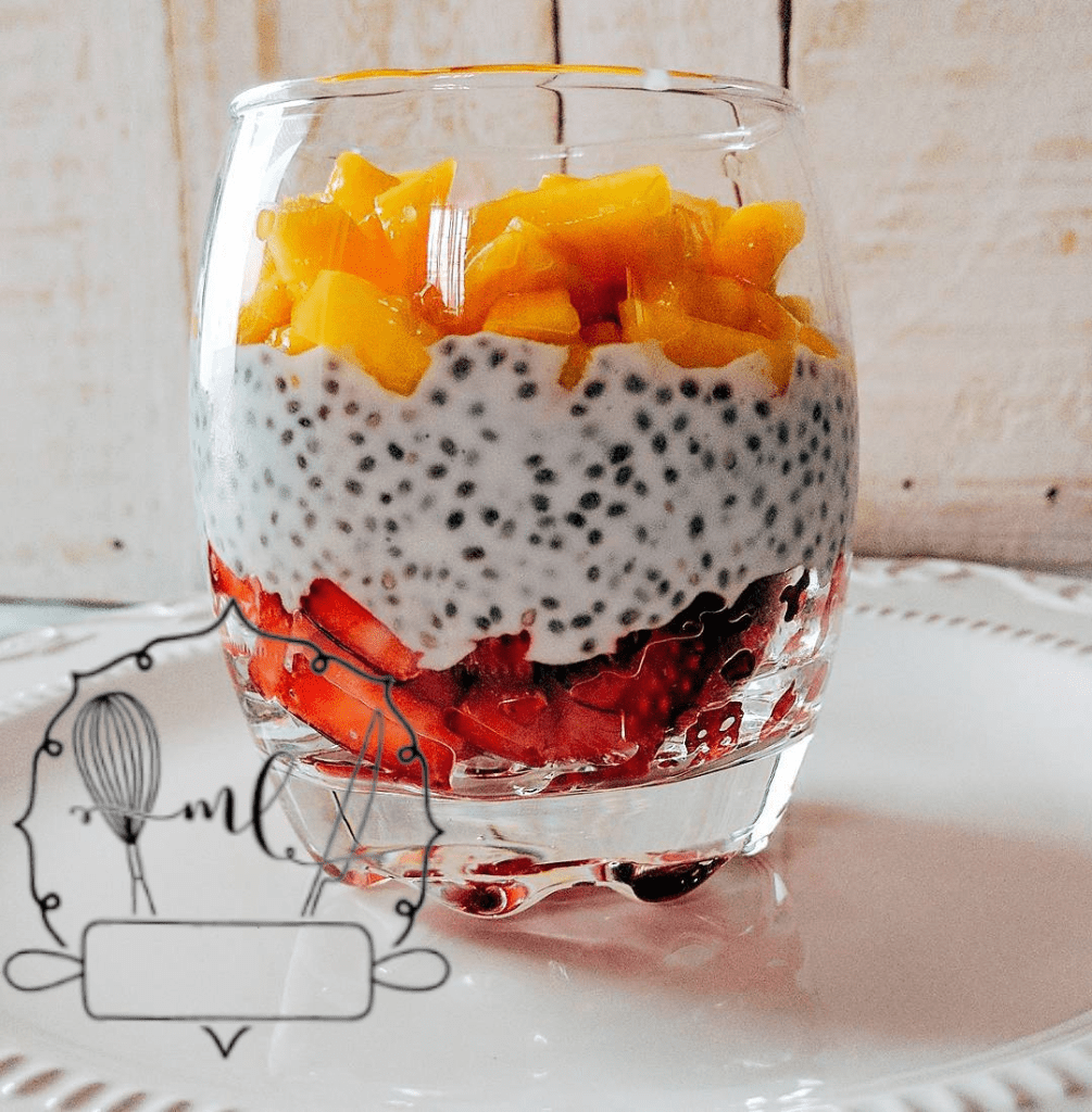 Y ya solo queda montar: ponemos las fresas en el fondo, el yogur con chia en el centro y el mango coronando el postre.