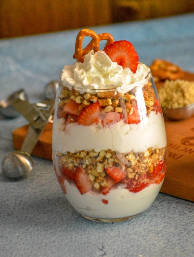 En sus tazas, agregue una capa de la mezcla de crema, fresas, luego pretzels. Repetir. Cubra cada taza con un poco de crema batida, una rodaja de fresa y un pretzel. Servir inmediatamente.