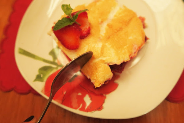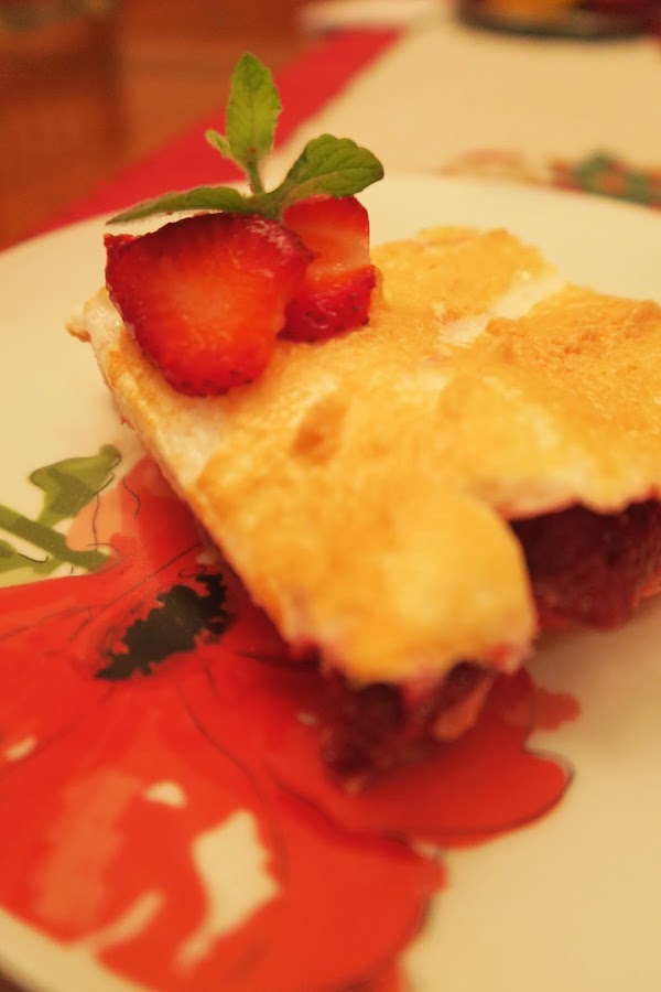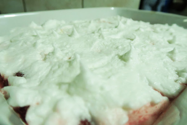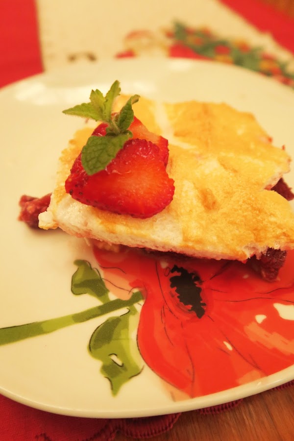 Añadir las frutillas y su jugo sobre la mezcla que está en la fuente y luego el merengue.