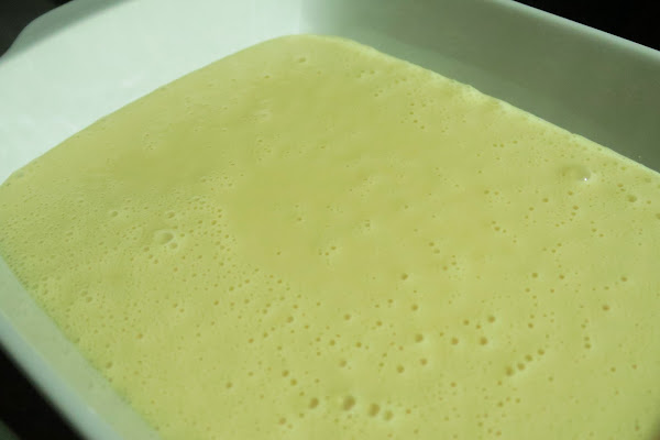 Verter la mezcla en una fuente y llevar al horno precalentado por 10- 15 min. (dependiendo de la potencia del horno), la idea es que quede como un flan.