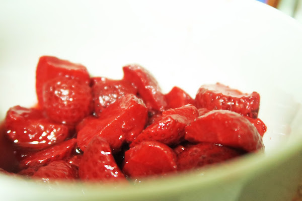 Retirar la fuente y dejar enfriar, y cortar las frutillas en mitades. Luego preparar el merengue con las tres claras de huevo y la cucharada de azúcar impalpable.