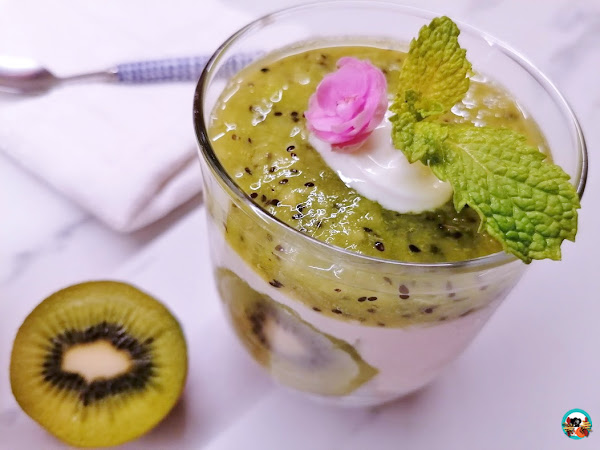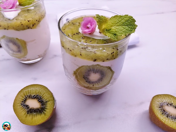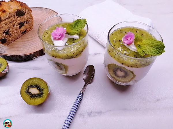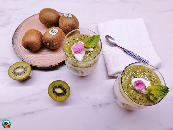 1.- Rellenamos el fondo del vaso con trozos pequeños de bizcocho o de magdalenas. Cortamos la fruta en rodajas, ponemos dentro de cada vaso 2 rodajas de kiwi. Cubrimos la fruta con el yogur griego. Trituramos el resto de la fruta, cubrimos el yogur con el puré de kiwis. Guardamos los postre de kiwis en la neveras hasta el momento de servir.