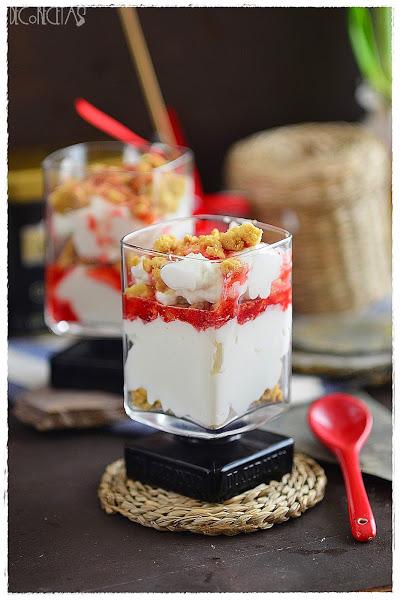 Montamos dentro del vasito, añadiendo una capa de galletas, capa de queso, y queso de sirope. Repetimos y añadimos la cantidad que queramos de cada vez hasta rellenar el vaso.