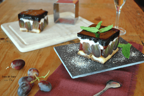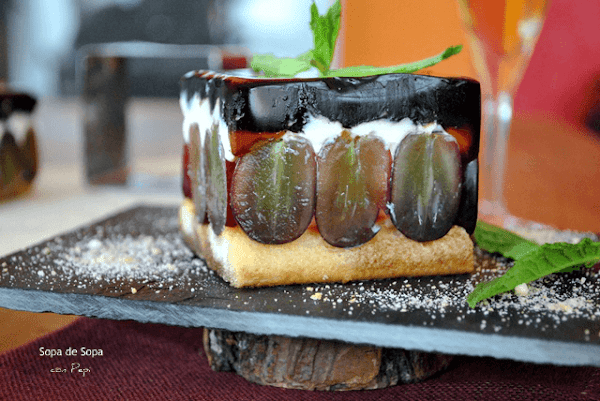 Montar la nata (crema de leche). Cortar la vaina de vainilla por la mitad y sacarle las semillas pasándole la punta de un cuchillo. Echar las semillas al mascarpone, más 30 gramos de azúcar. Remover. Echar la nata (crema de leche) y mezclar con movimientos envolvente, de arriba abajo. Rellenar los moldes con cuidado con la crema. Meter en la nevera mínimo 1 hora. Mientras poner la vaina de vainilla y los granos de pimienta de Jamaica en el resto del vino que nos haya sobrado y dejar infusionar tapado. Pasada la hora colocar por encima de la crema el resto de las uvas reservadas. Poner el vino dulce colado en un cazo y, echar el resto del azúcar y los polvos de gelatina. Mezclar y llevar a ebullición sin dejar de remover. Apartar, dejar enfriar 1 minuto y verterlo sobre las uvas que están en el molde. Meter en la nevera de nuevo unos 30 minutos.