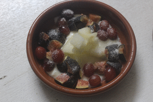 Entre cada montañita de brevas, colocamos 3 uvas.
