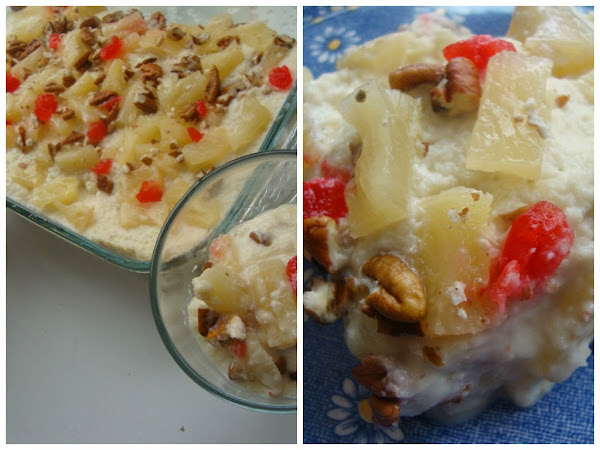 Pues se trata de colocar una capa de pan en el fondo de un refractario, todo desorillado o descortezado. tapamos toda la superficie del molde, bañamos con la salsa y colocamos un poco de piña picada muy finito, incluso la puedes desbaratar con las manos, agregas la nuez picada y colocas otra capa de pan blanco sin la corteza.