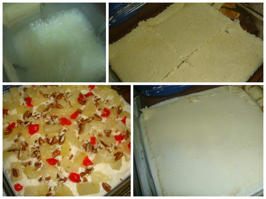 Bañas nuevamente con más salsa, y agregas más piña, y nueces, y así sucesivamente hasta terminar el pan, o llenar el molde. Debemos terminar con una capa de piña picada, nueces y cerezas.