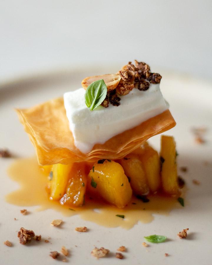 Para montar el postre coloca un par de cucharadas de piña salteada, encima un crujiente de pasta filo y encima el helado de nata (crema de leche), yo lo corto como un cubo rectangular. Si tengo alguna granola en casa le añado un poquito encima para darle un toque crujiente, la granola de cacahuete del blog le va fetén. Colocamos una hoja de albahaca fresca encima y listo.