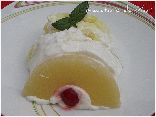 Al siguiente día cubrimos la superficie del postre con el chantilly, decoramos con la piña que teníamos reservada y las cerezas. Dejamos en la nevera hasta el momento de servir.