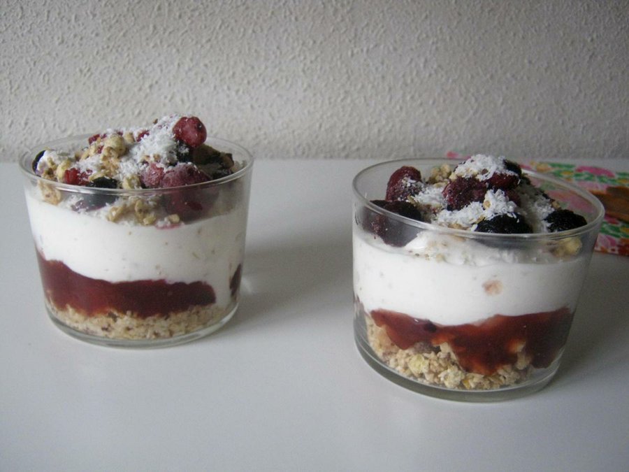 Prepararlo es muy sencillo, sólo vais a necesitar vuestro yogurt favorito (yo he comprado griego desnatado), muesli (tenía en casa con trozos de chocolate), mermelada (la que os venga bien) y las frutas que queráis (yo siempre suelo tener frutos rojos en el congelador).