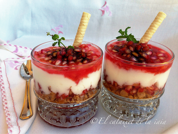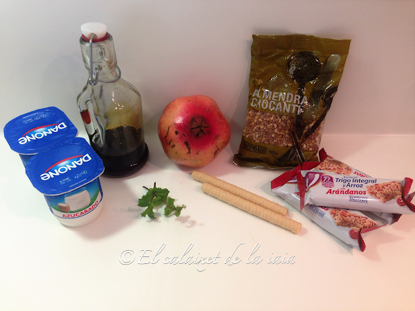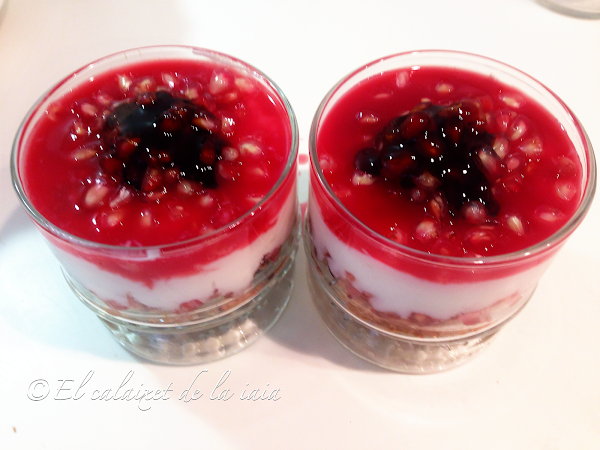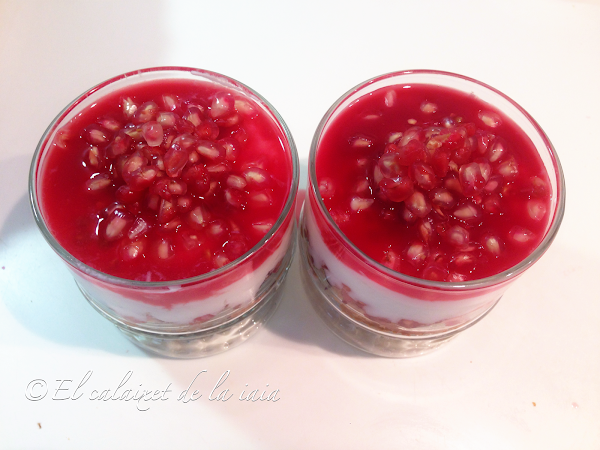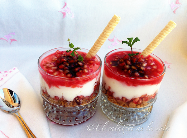Como he preparado para comer unas "Migas con granada" y me había sobrado unos granos con zumo, he mirado en la nevera y tenía yogur, unas barritas de muesli en la despensa....pues ya está, un buenísimo postre en vaso. Esta es una muestra de que se puede hacer un postre en plan rápido, cuando no disponemos de tiempo, así que ya sabéis que no hay excusa ;)