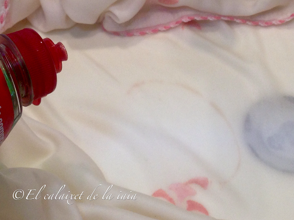 Antes de comenzar con la elaboración, y como al hacer las fotos he tenido la mala suerte de que el mantelito se ha manchado con el zumo de la granada, voy a hacer un dos por uno y explicaros uno de mis trucos para eliminar ésta mancha.