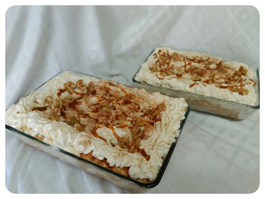 5.- Vierta la crema pastelera sobre los bizcochos y cubra con otra capa de bizcochos sin mojar. Extienda el resto del dulce de leche y cubra con la nata montada (crema de leche). Reserve en el frigorífico un mínimo de 4 horas o mejor de un dia para otro.