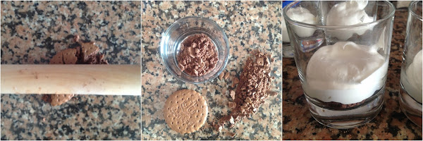 Quitamos el relleno a las galletas y las molemos aplastándolas con el rodillo sobre la encimera o una tabla. Colocamos 2 cucharadas de galletas molidas en cada vaso y cubrimos con dos cucharadas de crema.