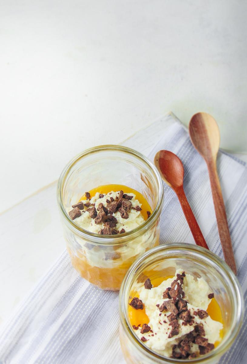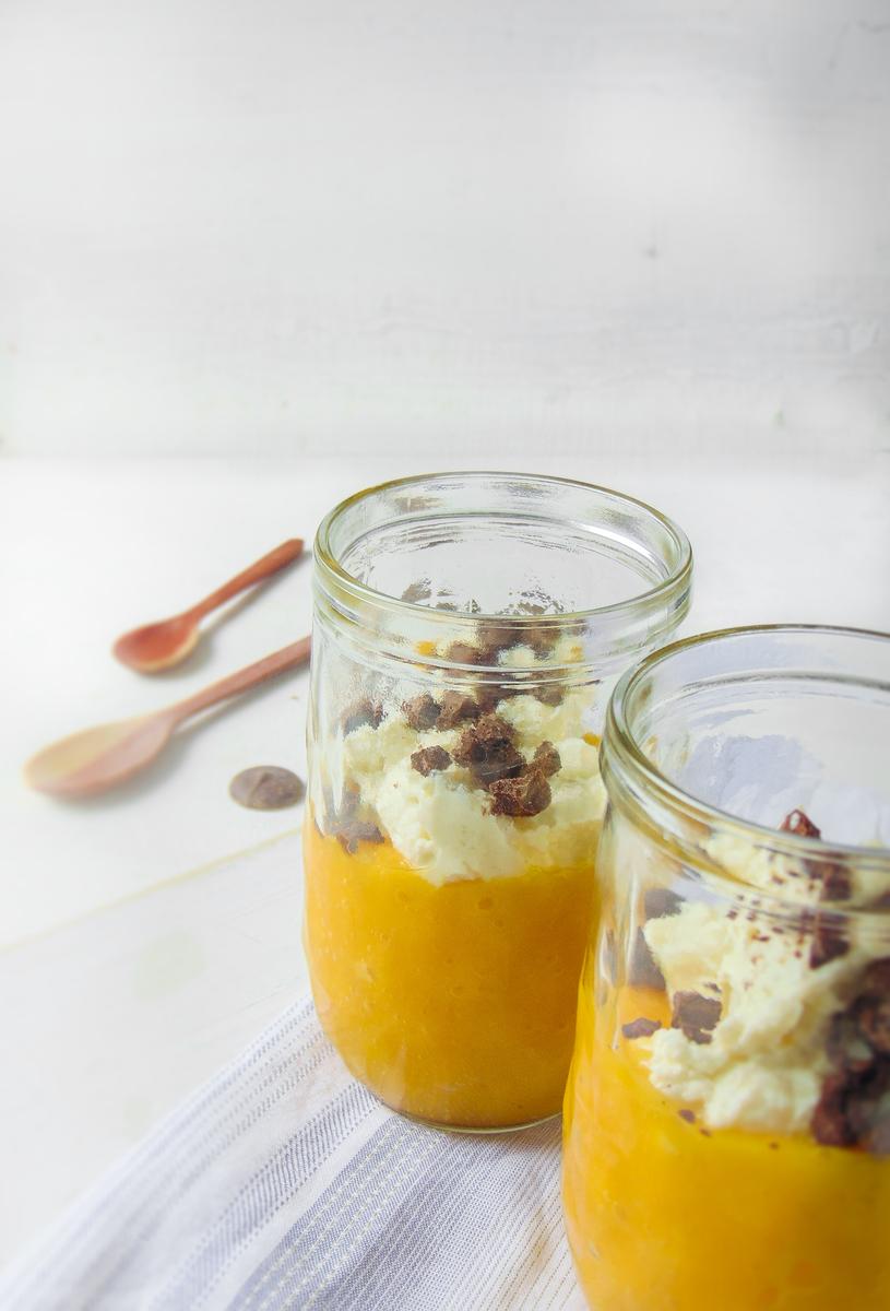 Sacamos de la nevera los vasos con la crema de mango, agregamos por encima el relleno de cannoli y bañamos con el chocolate.