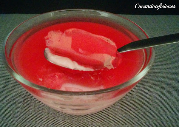 Echamos la mezcla de la gelatina y yogur en los recipientes donde lo vayamos a servir, metemos en la nevera y cuando este cuajado, en unas 3 horas, hacemos el resto de la gelatina que teníamos reservada, esta vez añadiendo menos de la mitad de un vaso de agua.