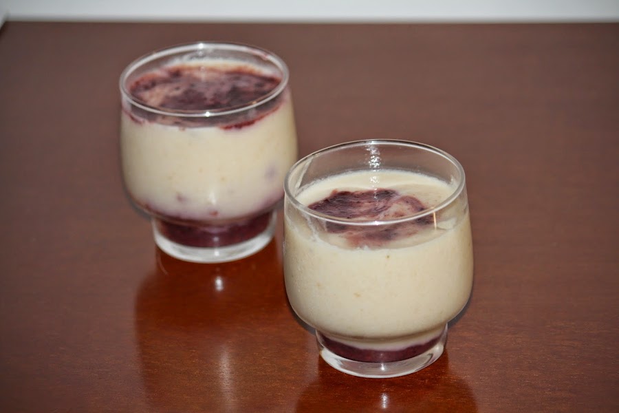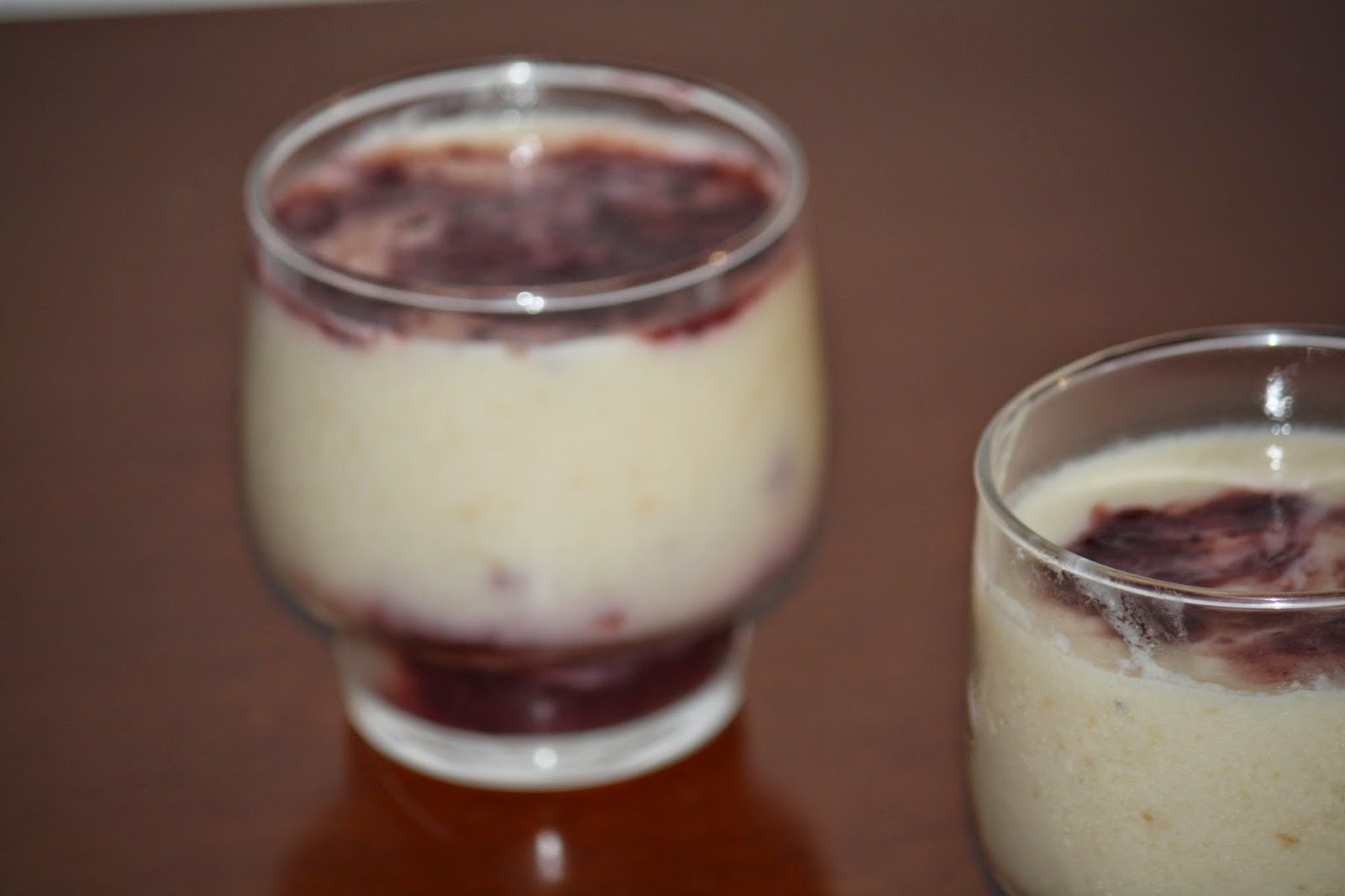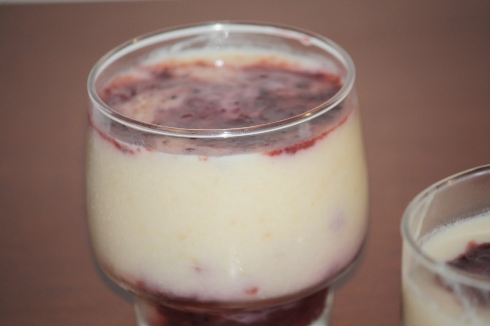 Vertemos unas cucharas de frutos rojos en el fondo de los moldes que usaremos y sobre este la crema de pera.