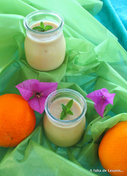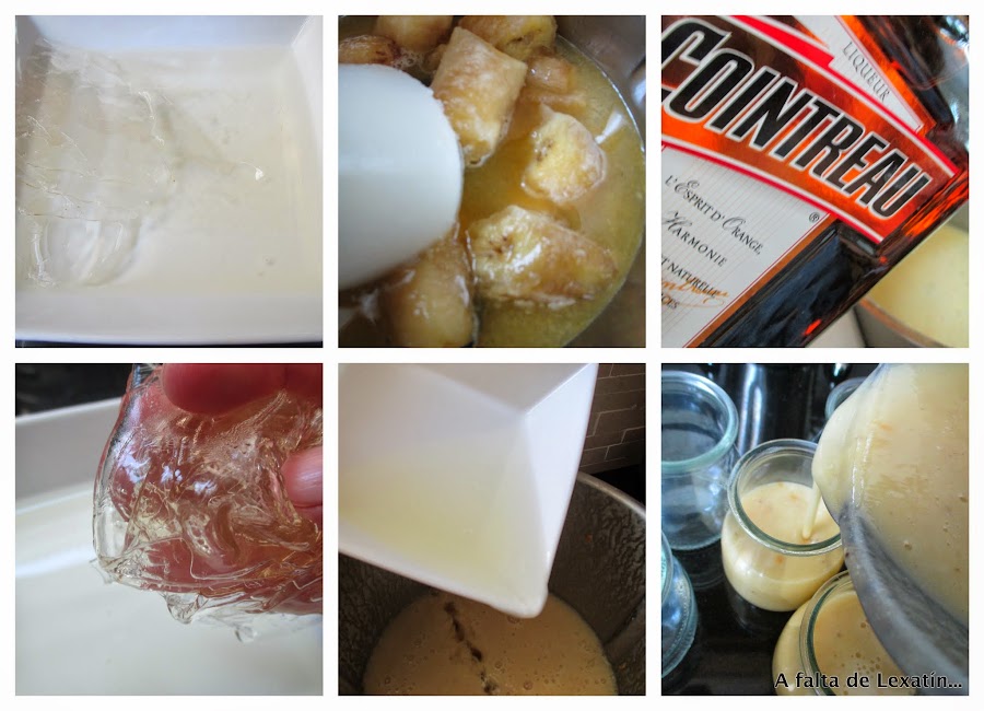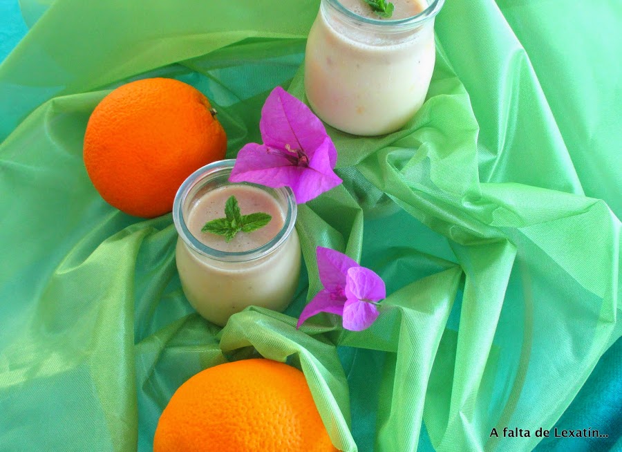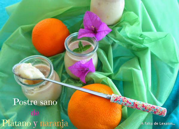 Tenía unos platanos de esos que dan grima , que ya no son amarillos sino bien marrones que habia que reciclar en algun postre que no tuviera muchas calorias y ademas nos gustara... pues nada, platanos , naranja y yogur... no necesita azucar porque el platano maduro ya la aporta . Como no me gusta la textura "papilla de fruta de bebé"le añadí un poco de gelatina...y Cointreau...qué buen ingrediente secreto jajajaja y ...ta chaaaaan postre que no da cargo de conciencia ninguno y que con este calor sienta genial