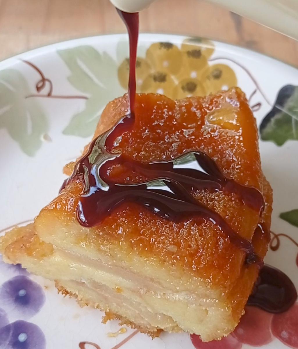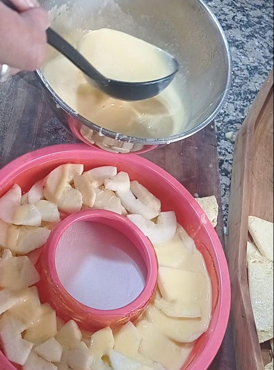 Vuelve a repetir poniendo otra capa de rebanadas de pan pero con la manteca hacia arriba, encima manzanas y el resto del batido.