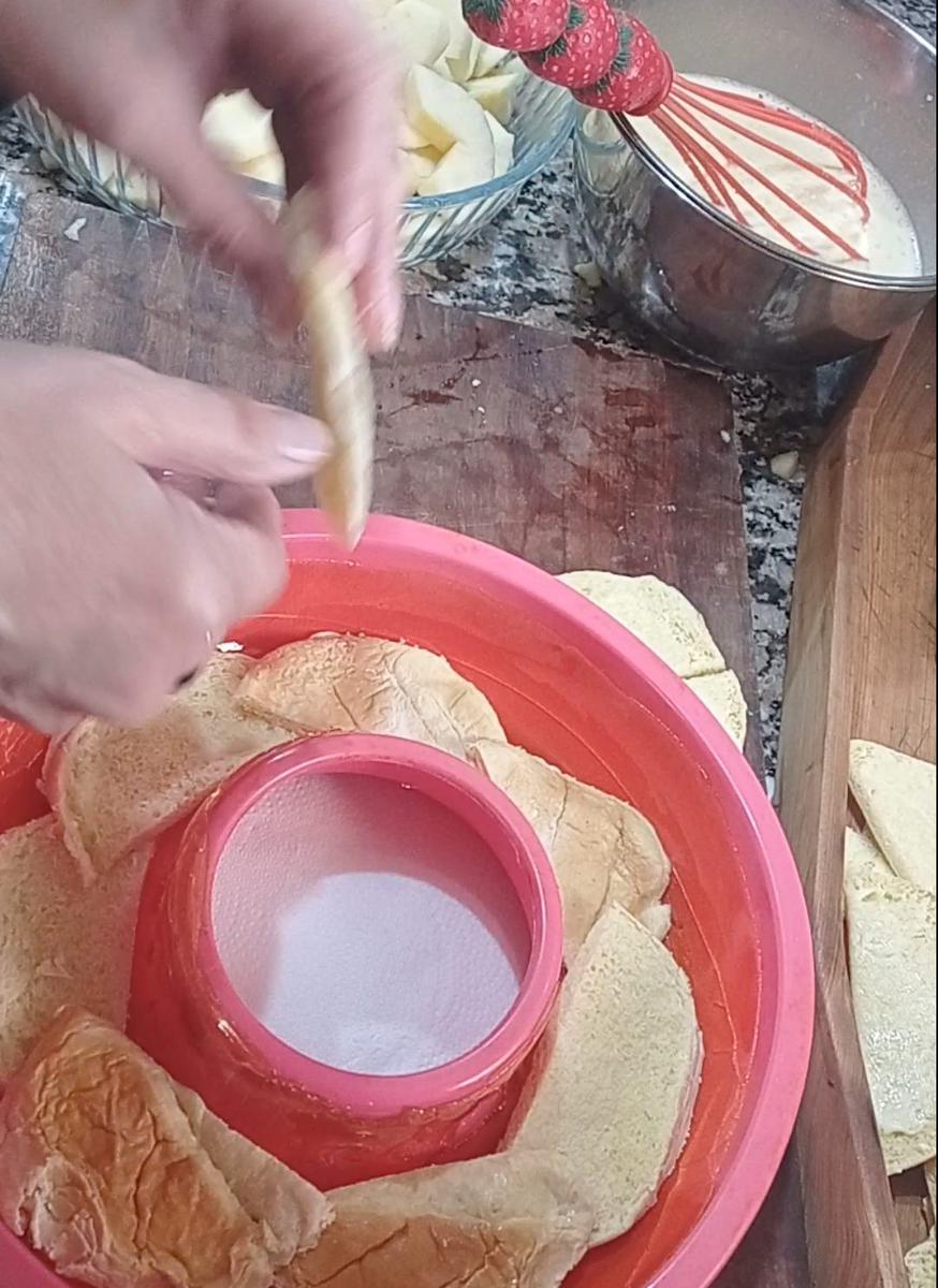 cubre el molde con las rebanadas de pan con la manteca hacia abajo en esta primer capa, para facilitar el desmolde, luego acomoda las rodajas de manzana encima y cubre con una parte del batido.