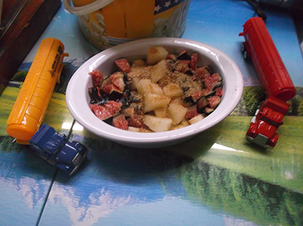 Cortamos a trocitos pequeños (aptos para una cuchara de postre) el plátano y lo mezclamos con las natillas.