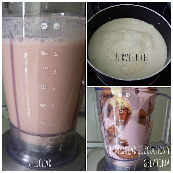 Mientras tanto, en el vaso de la licuadora ponemos los bizcochos troceados y los 2 sobres de gelatina