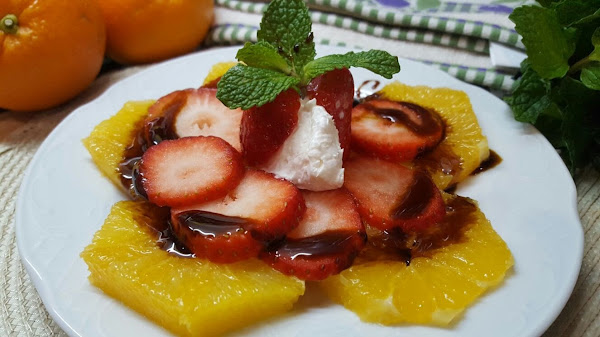 Elaboración: Pelamos las naranjas, le quitamos también la piel blanca. Lavamos las fresas, las secamos con papel de cocina y las cortamos en laminas, cortamos en rodajas las naranjas. Las disponemos sobre un plato, vertemos por encima una cucharada de miel, le añadimos una cucharada de nata montada (crema de leche) y decoramos con la hierbabuena fresca. Servimos enseguida.