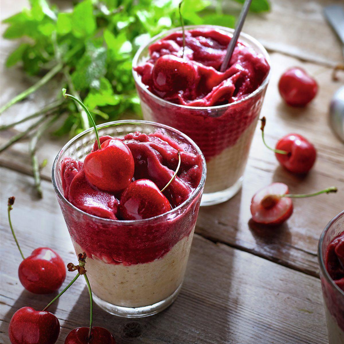 Posteriormente pondremos todos los ingredientes del helado en la batidora a máxima potencia y con ayuda de un removedor hacemos el helado. Luego, para servir, batimos los cubitos del granizado. Ponemos una bocha de helado en un vaso ancho y el granizado de cerezas por arriba. Podemos incluso decorar con cerezas enteras para una presentación más atractiva.