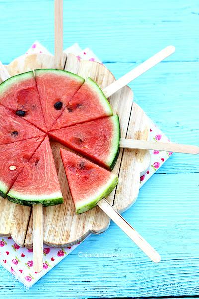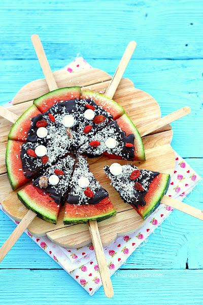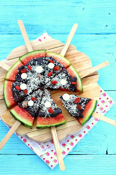 Necesitaréis cortar una rodaja gruesa de sandía, aproximadamente de 1,5 cms de grosor. Cortar la rodaja en ocho trozos, como si fuera una pizza. Hacer una pequeña incisión en la base y colocar un palo de madera. Por último verter chocolate derretido encima de los trozos de sandía y adornar con frutos secos y coco rallado.