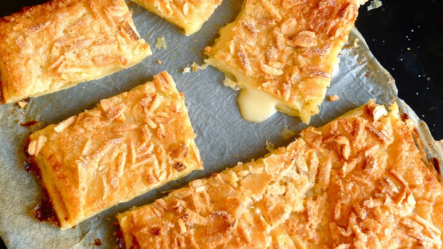 Sólo necesitarás 5 ingredientes que son 1 lámina de hojaldre, natillas, almendras laminadas, azúcar y huevos batido.