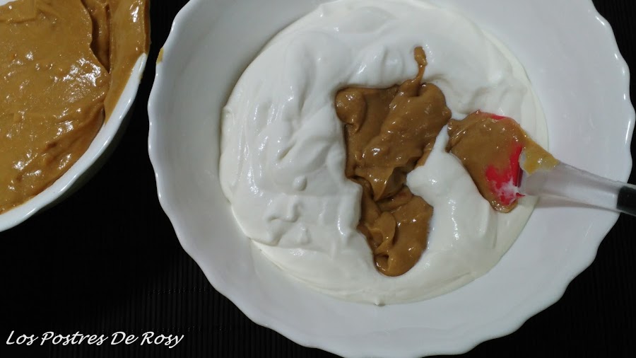- Agregamos la mezcla de turrón a la nata montada (crema de leche), poco a poco y con movimientos envolventes.