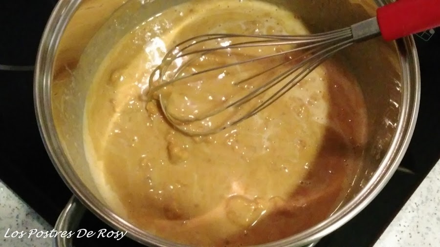 - En un cazo ponemos el turrón con la otra mitad de la nata (crema de leche) y cocinamos a fuego medio, mientras batimos con unas varillas, hasta que quede totalmente disuelto.