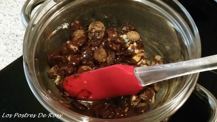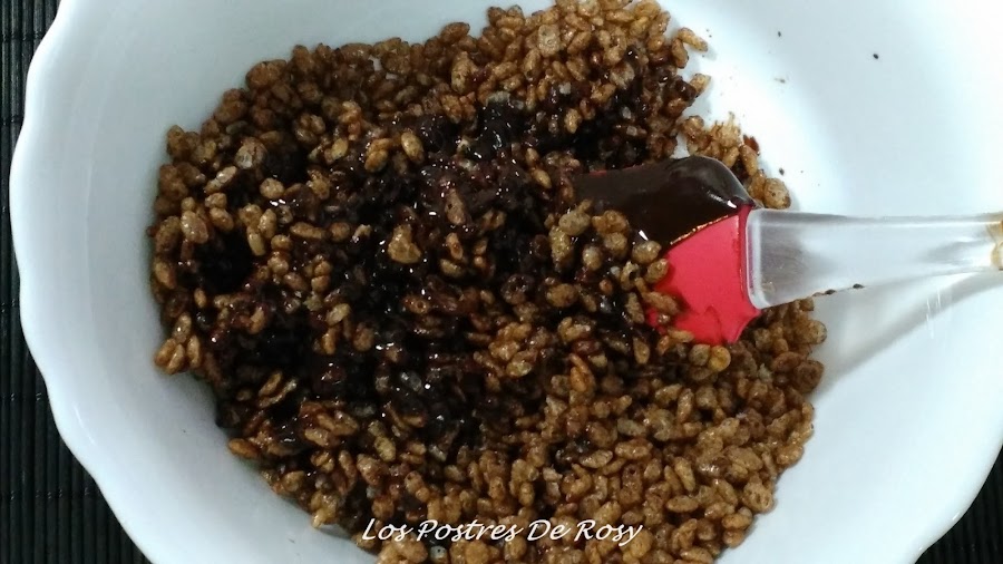 - En un recipiente amplio, mezclamos el chocolate fundido con los copos de arroz inflado, hasta que estén totalmente bañados en chocolate.