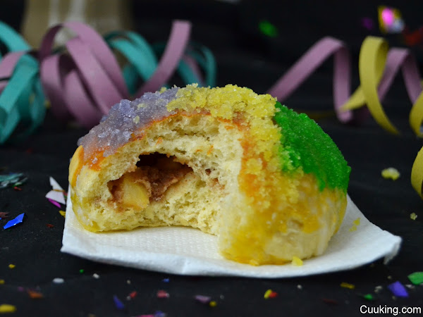 Nos alejamos un poco de España, para celebrar el martes de carnaval o mardi grass con este bollo típico de Estados Unidos. El relleno está de vicio, y con esos colores, este king cake es de lo más carnavalesco.