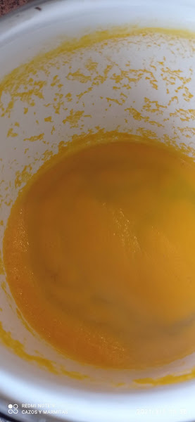 Calentar 250 ml. de zumo de mandarina con 50 gr de azúcar y añadirle 3 hojas de gelatina.