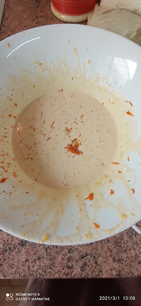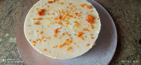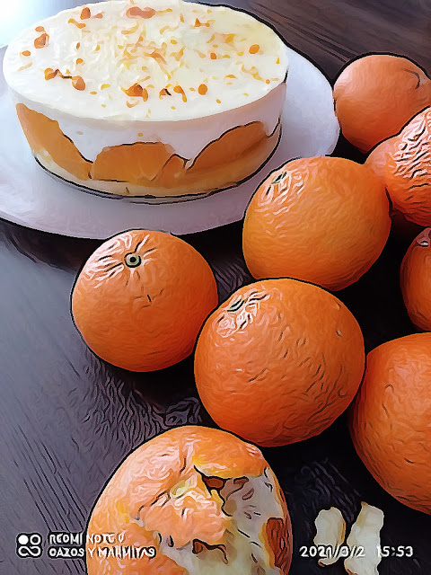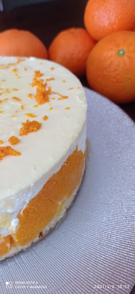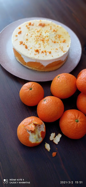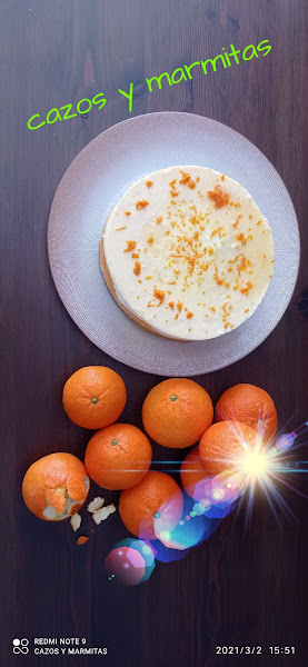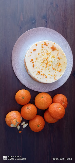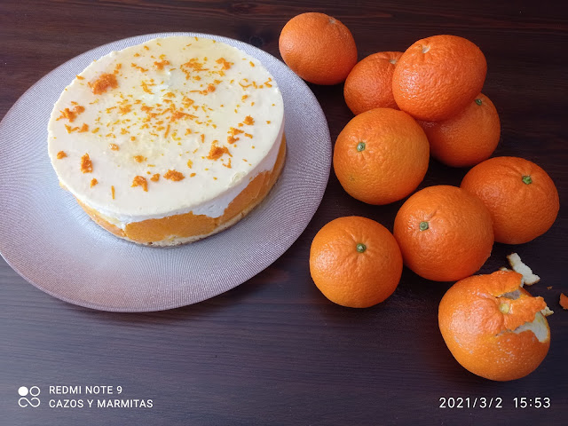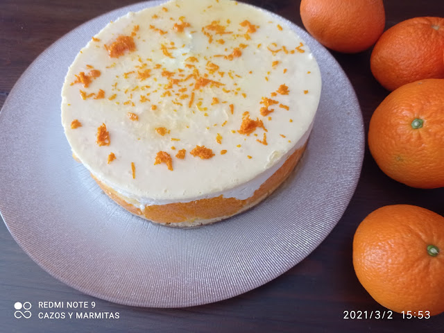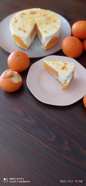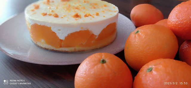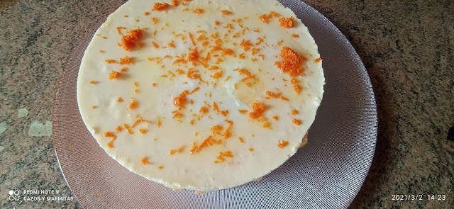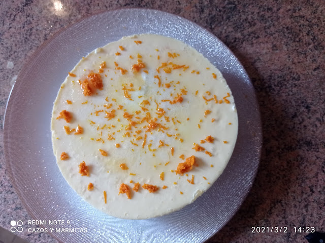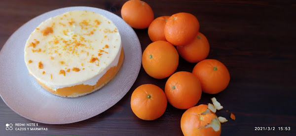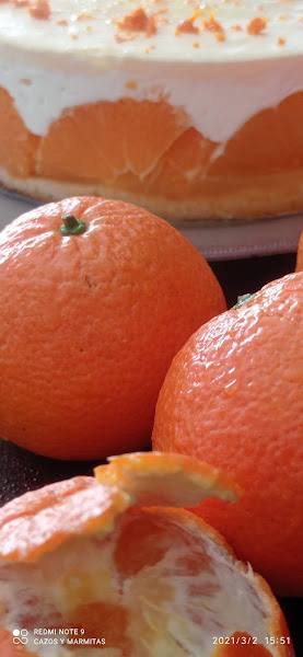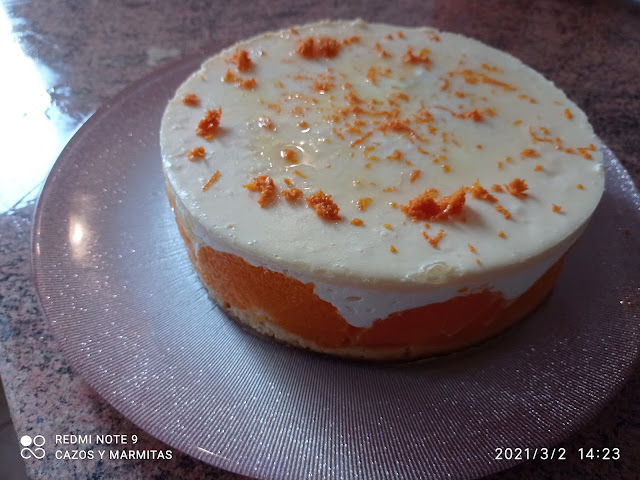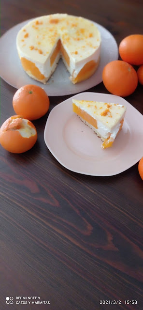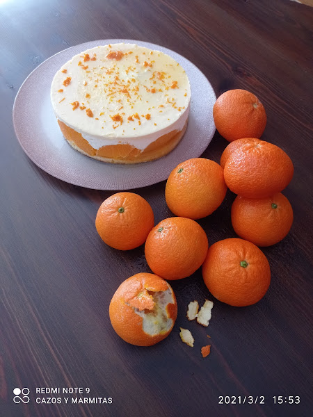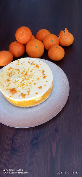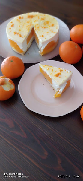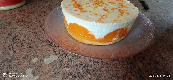 Una vez endurecido, elaborar una preparación compuesta de zumo de mandarina , azúcar y 100 ml. de nata (crema de leche), batir y volcar sobre la tarta hasta cubrir el bode del molde.